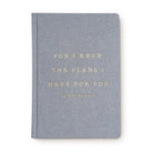 - • Size: 8.1 x 5.6 x 0.6” • Design: For I Know The Plans I Have For You Jeremiah 29:11 • Cool Grey Fabric Journal with Gold Foil Details • 100gsm Uncoated Lined Paper • Ribbon Bookmark in Gold • 100 Pages Front and Back (200 Total)