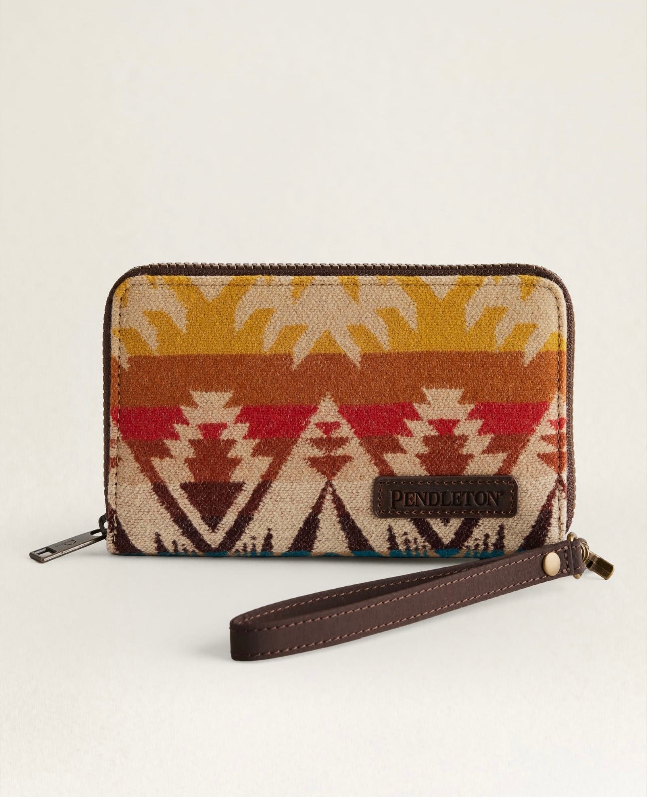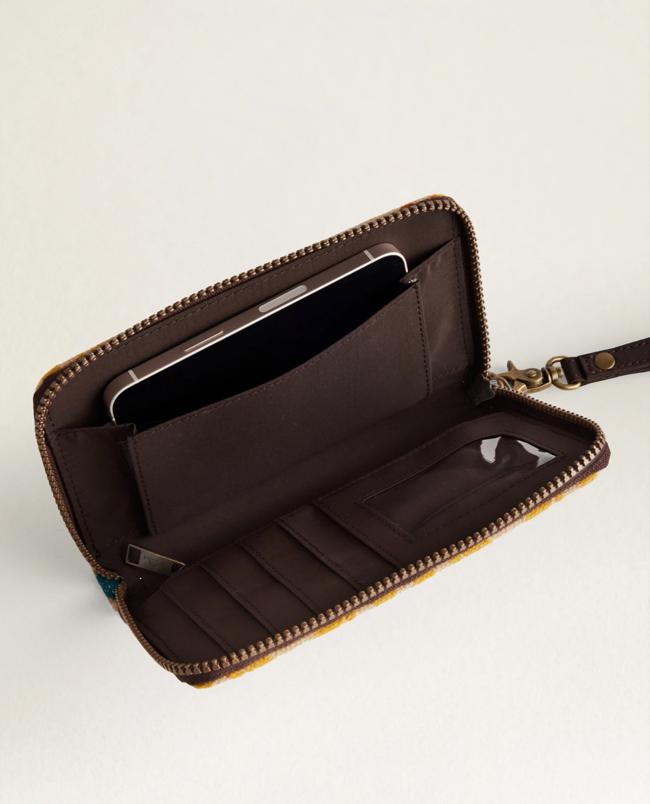 Carry your phone, ID, cards, cash and more in this handy trifold wallet covered in woven-in-USA wool jacquard, with RFID protection. Detachable wristlet strap. Pattern placement may vary.
