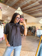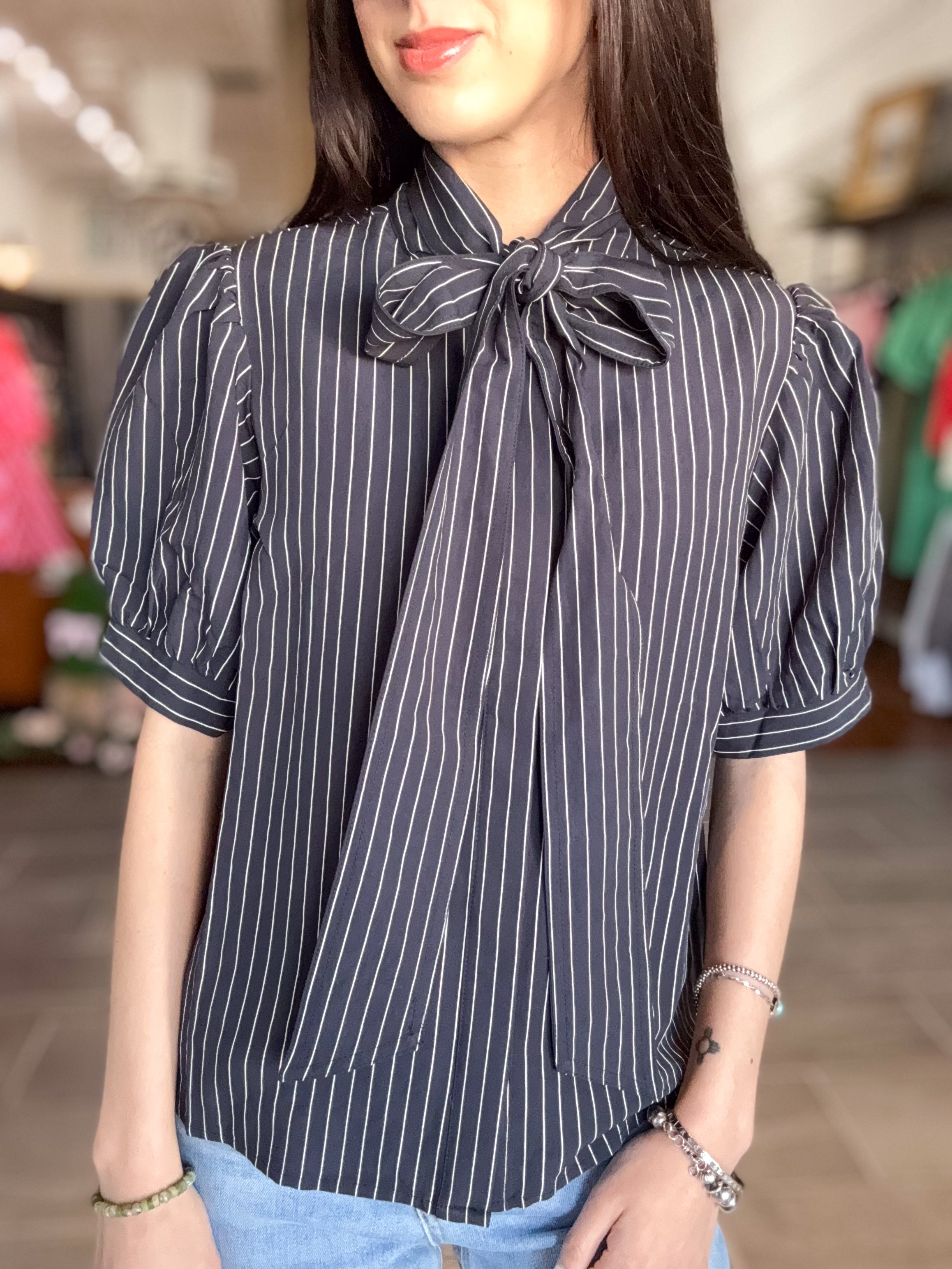 - Navy and white striped short sleeve bow top
