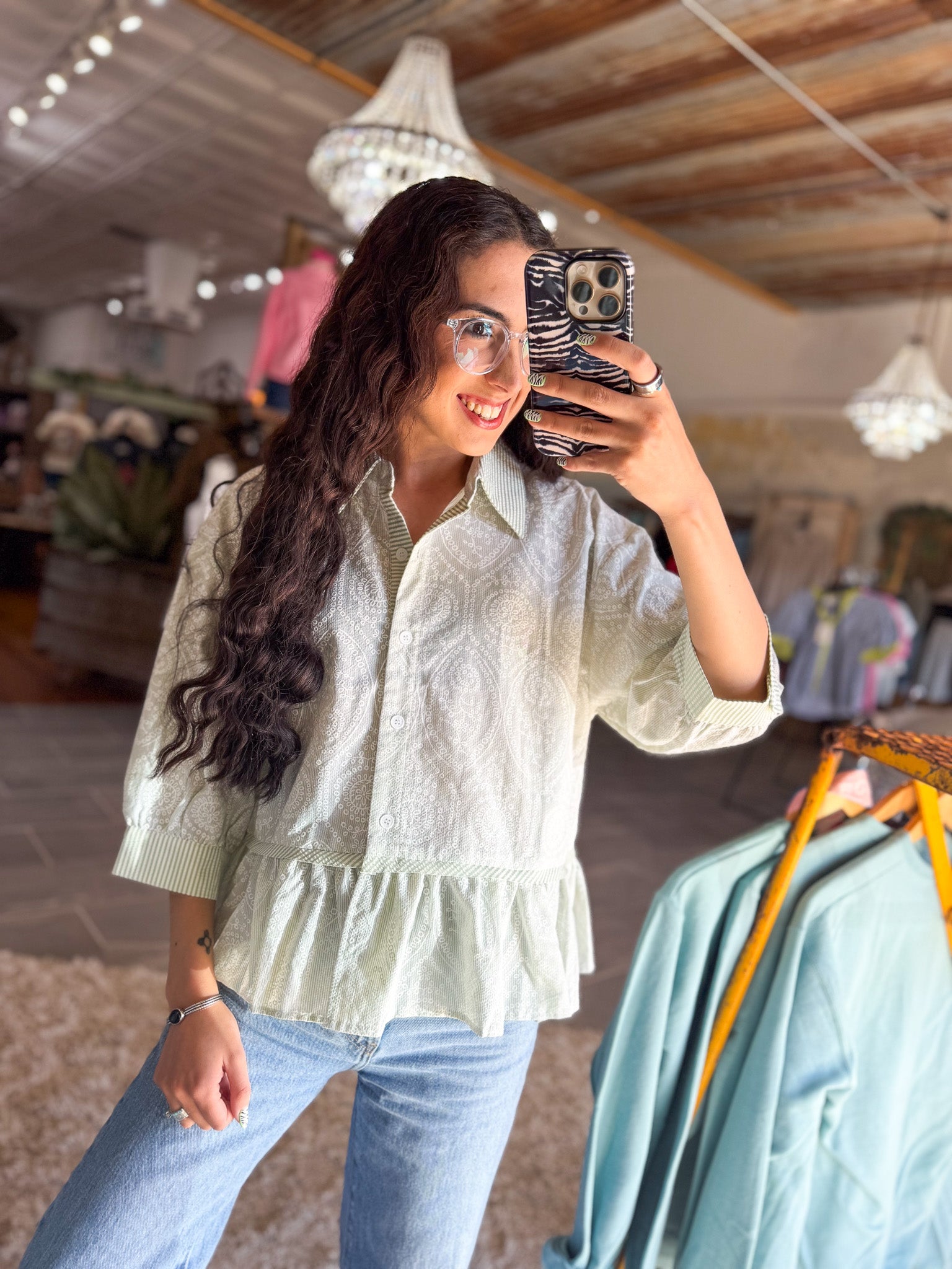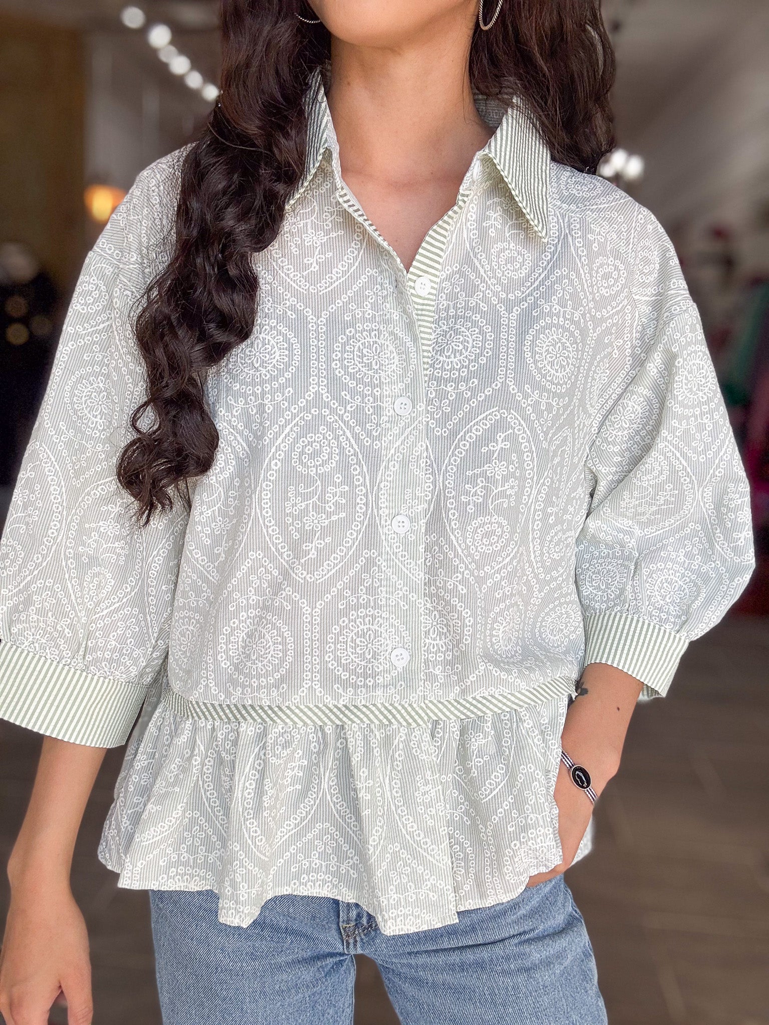- Floral button down with ruffle hem