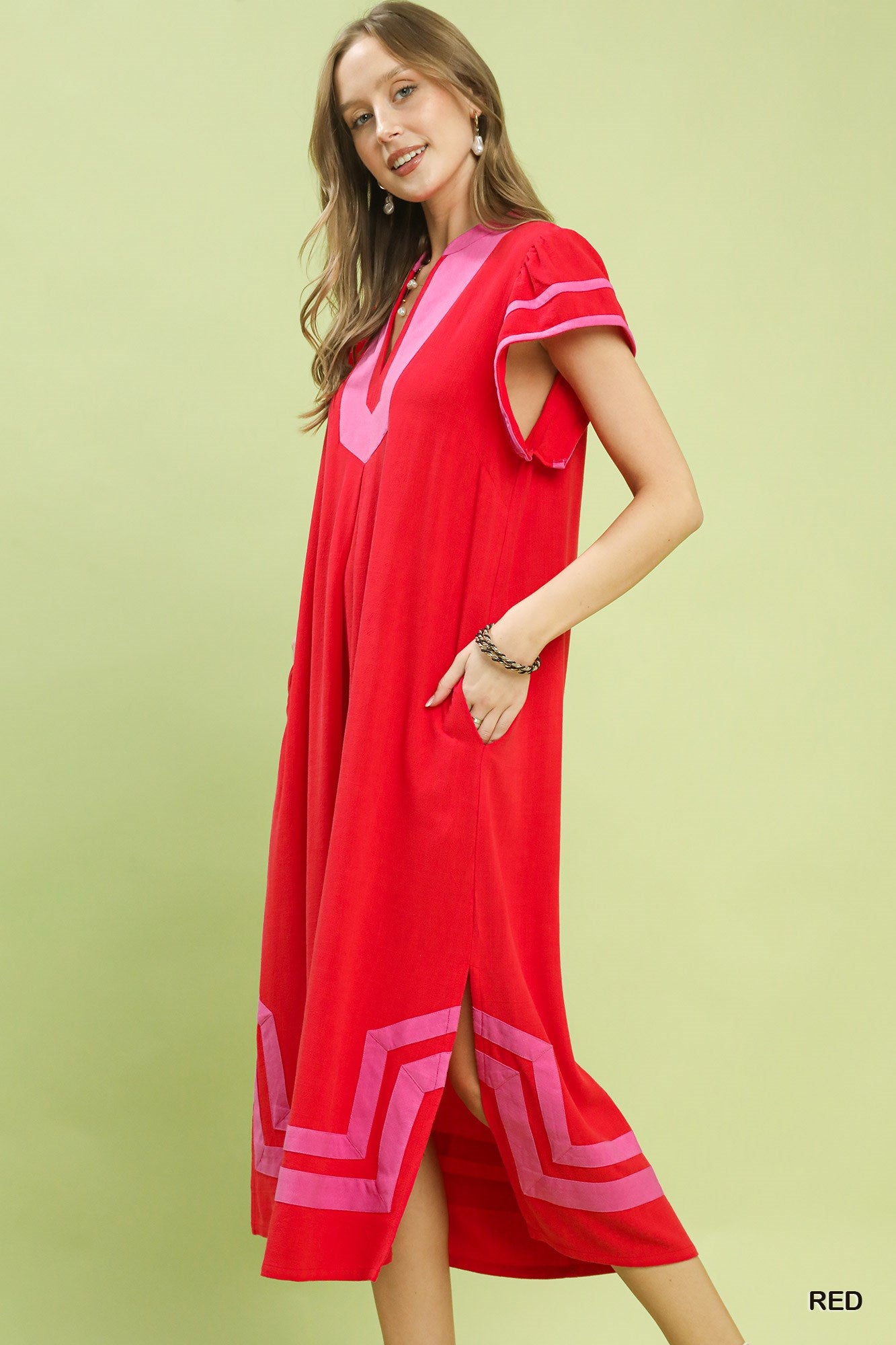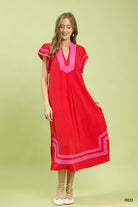 - Red & pink contrast midi dress