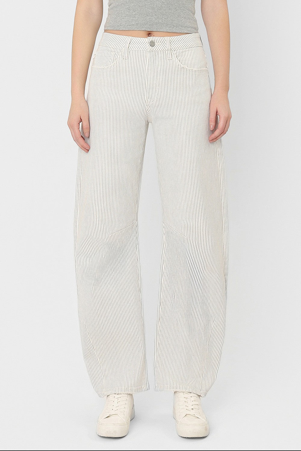 - Pinstripe barrel jean