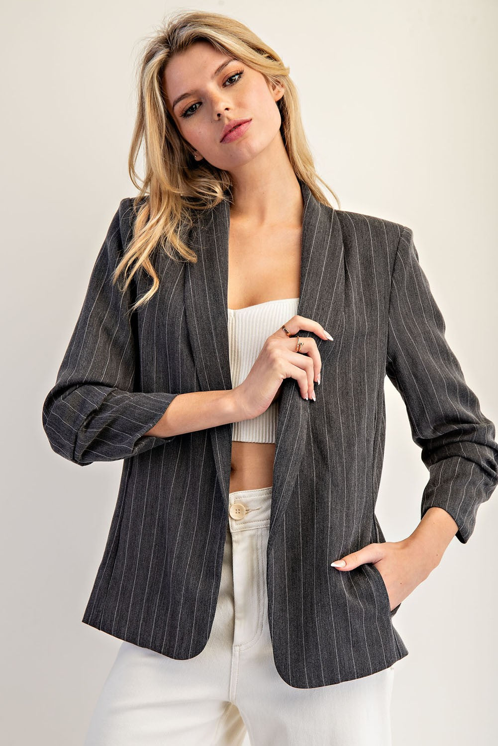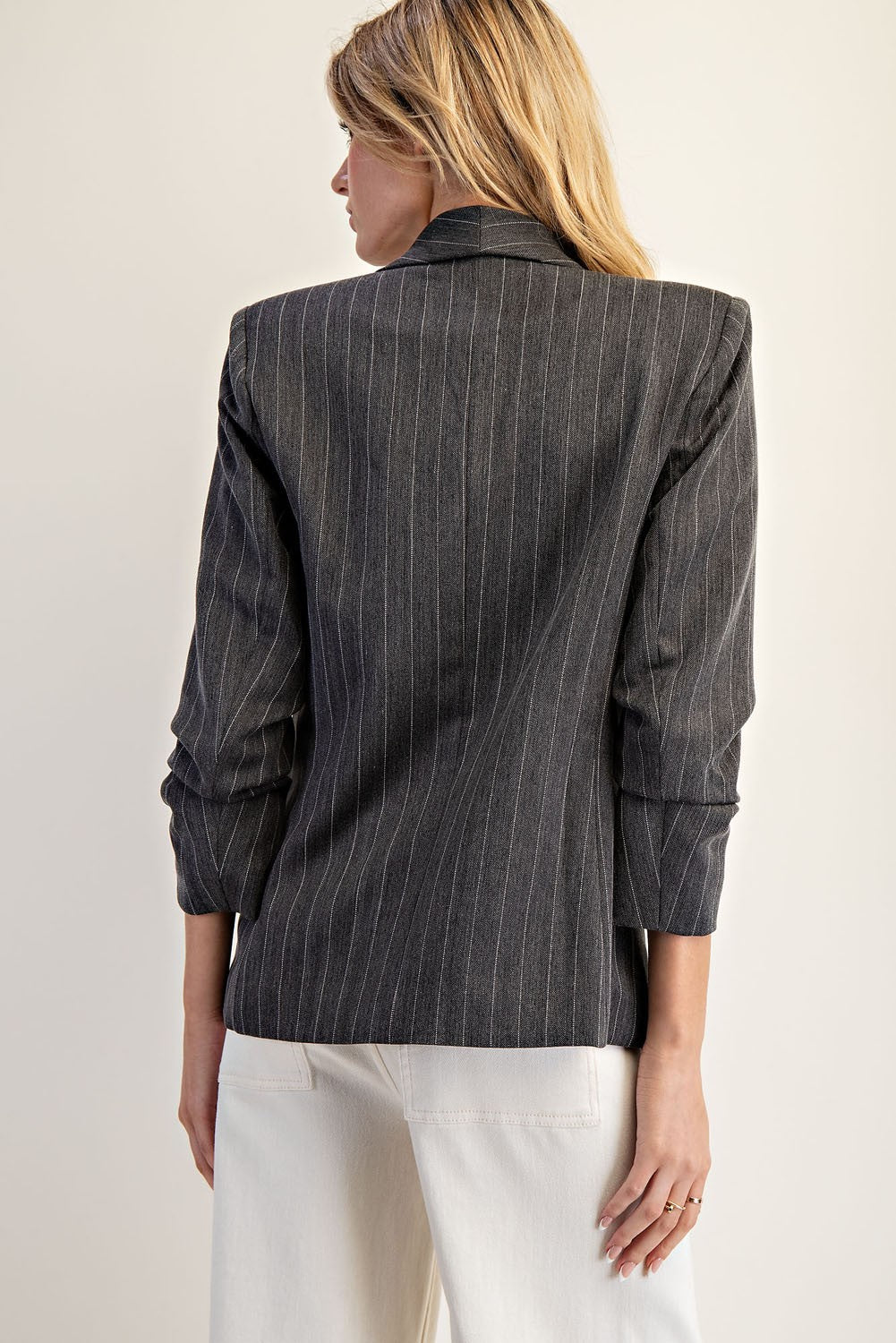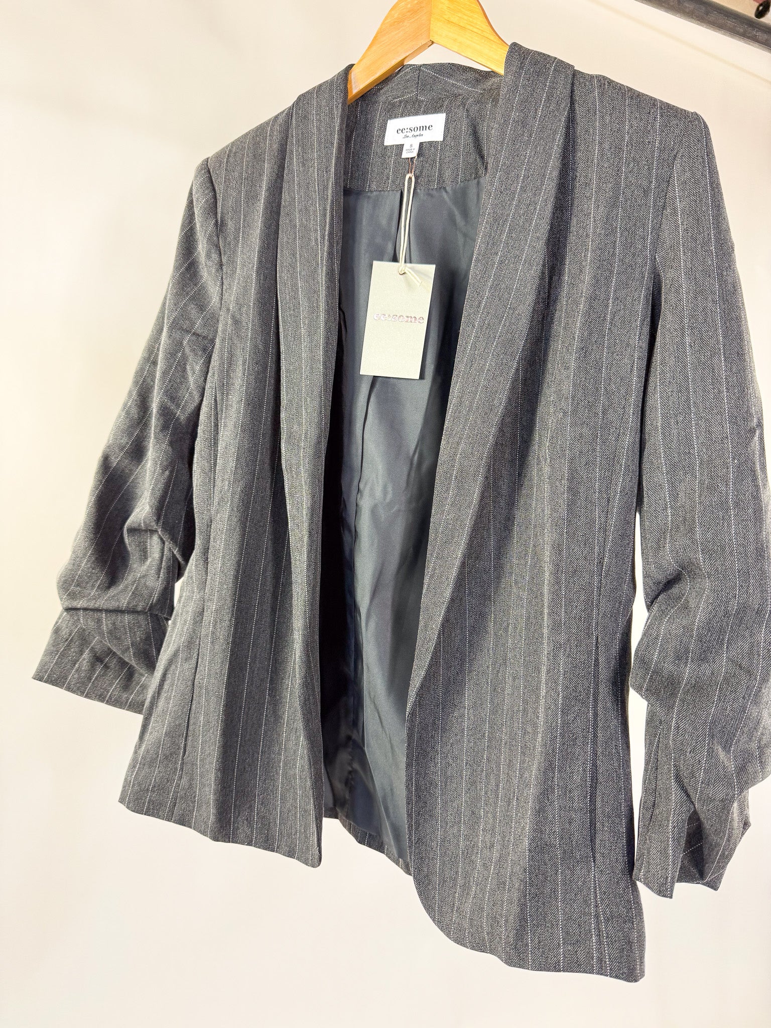 • Pinstriped scrunched sleeve blazer