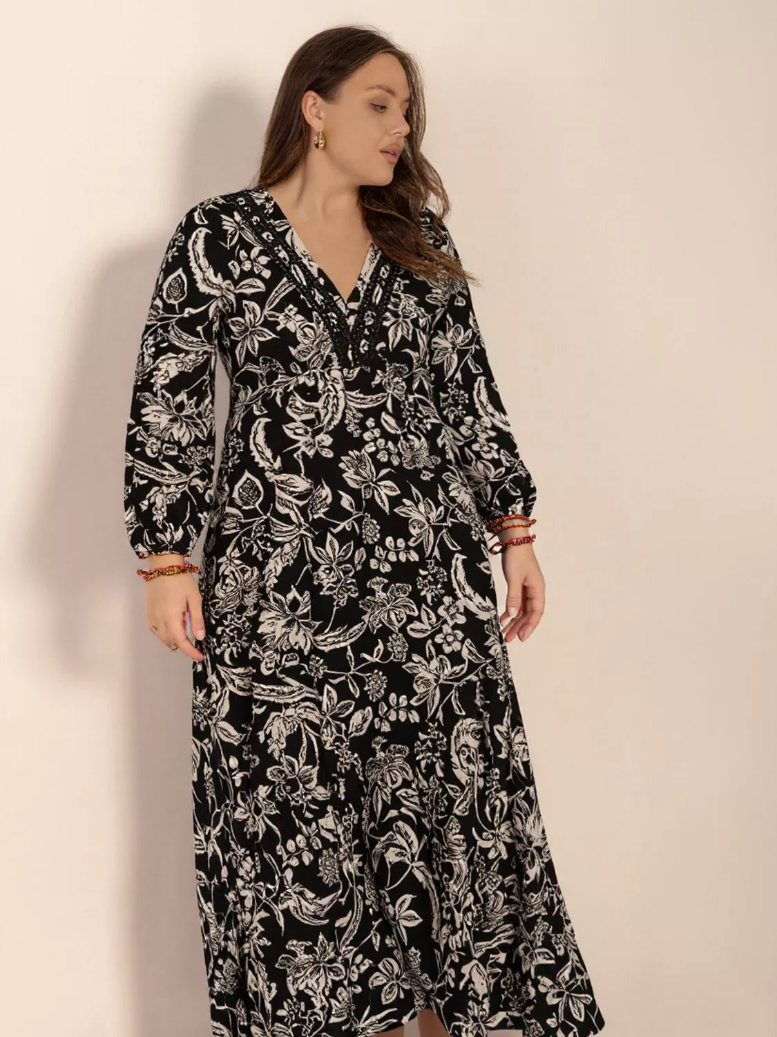 Plus Size Botanical Print Long Sleeve Midi Dress