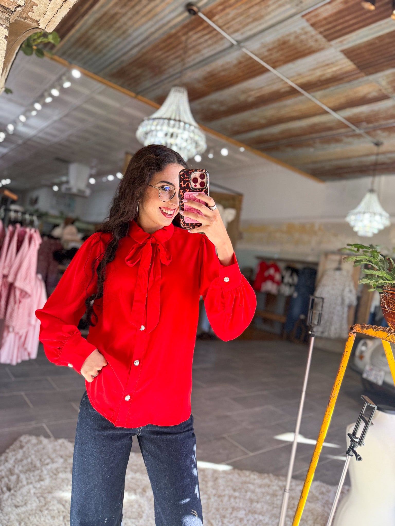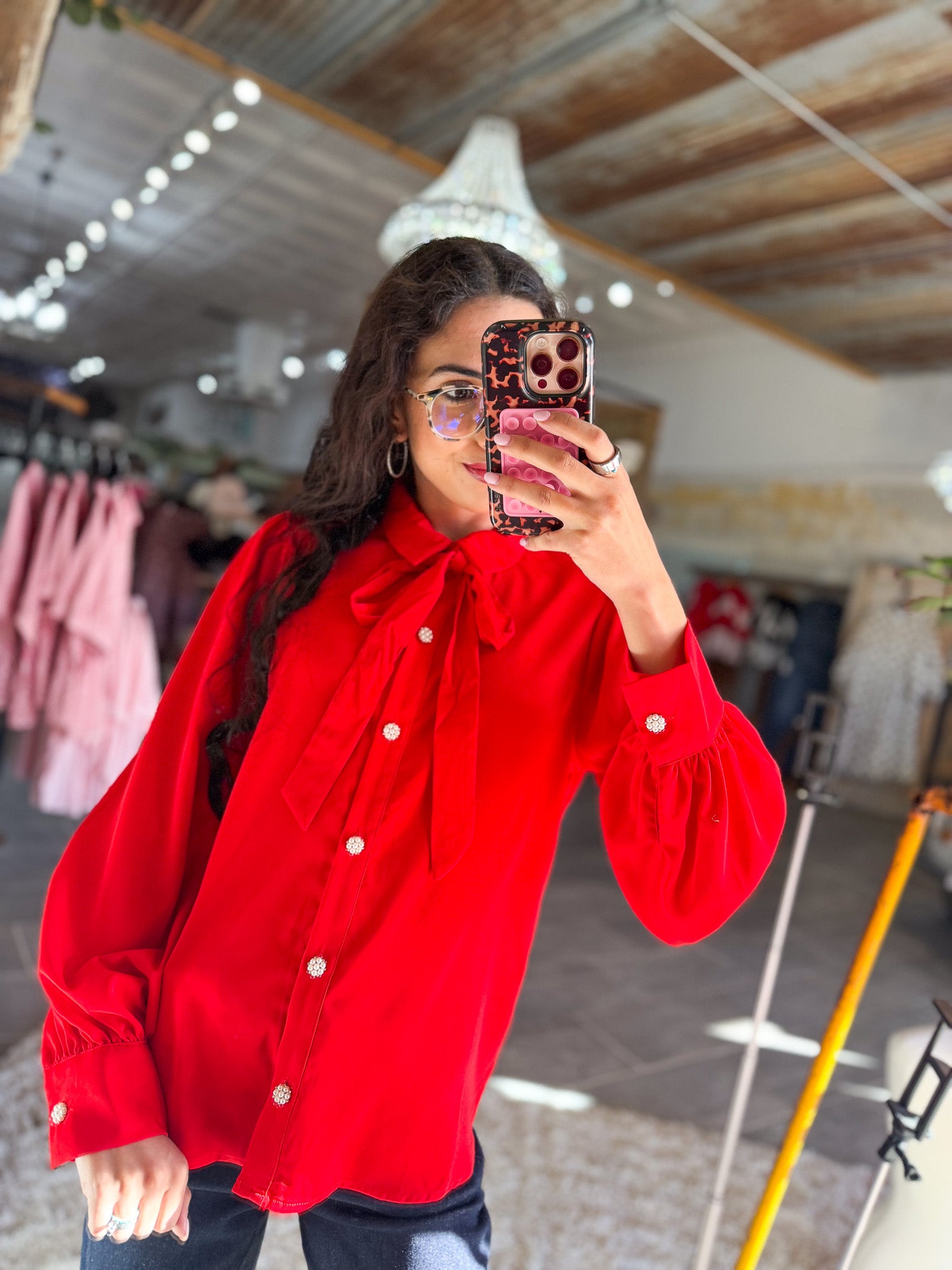 • Long sleeve collared top with removable bow and pearl buttons