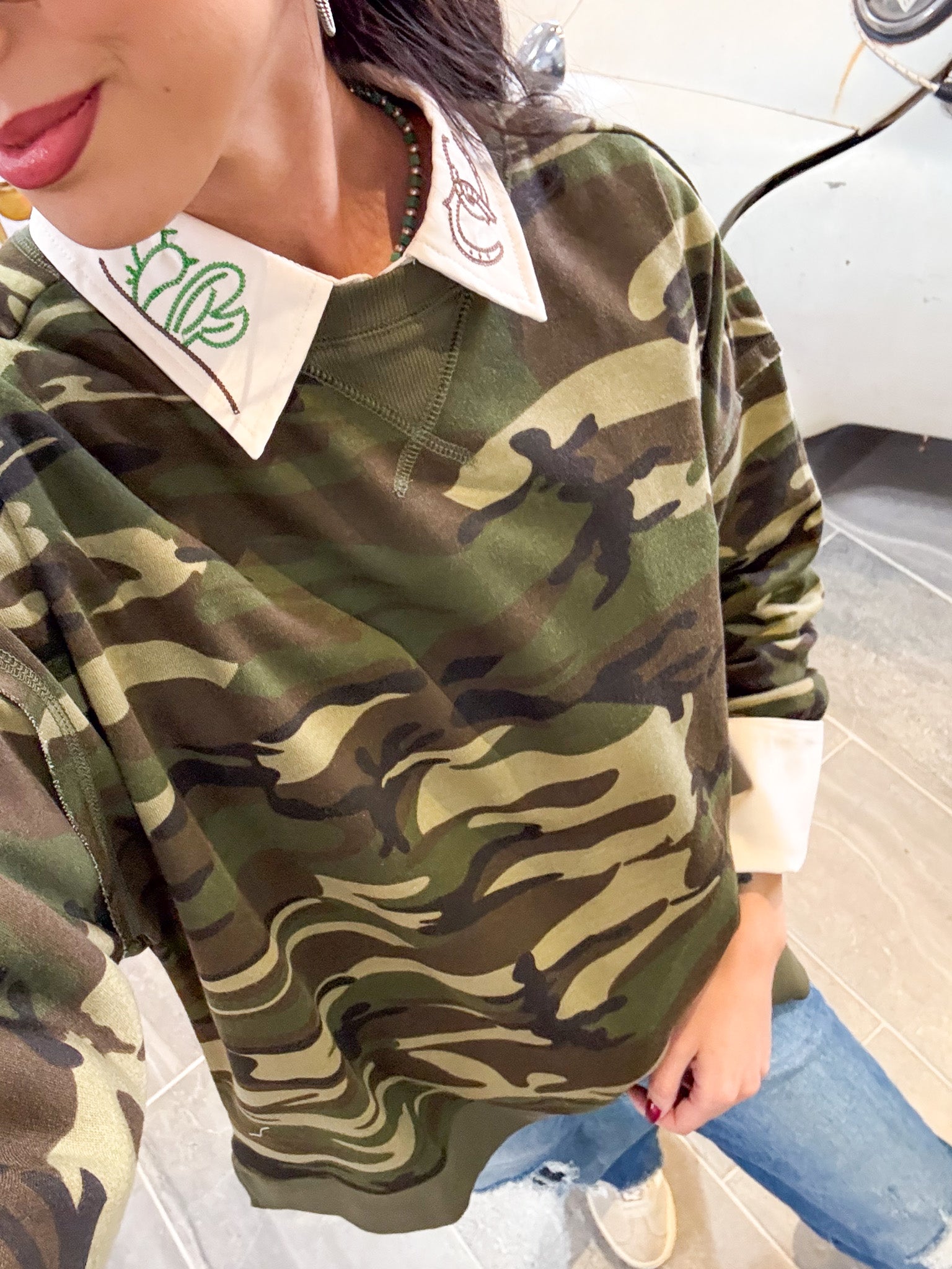 - Last photo J has it styled underneath a camo sweatshirt for a different look