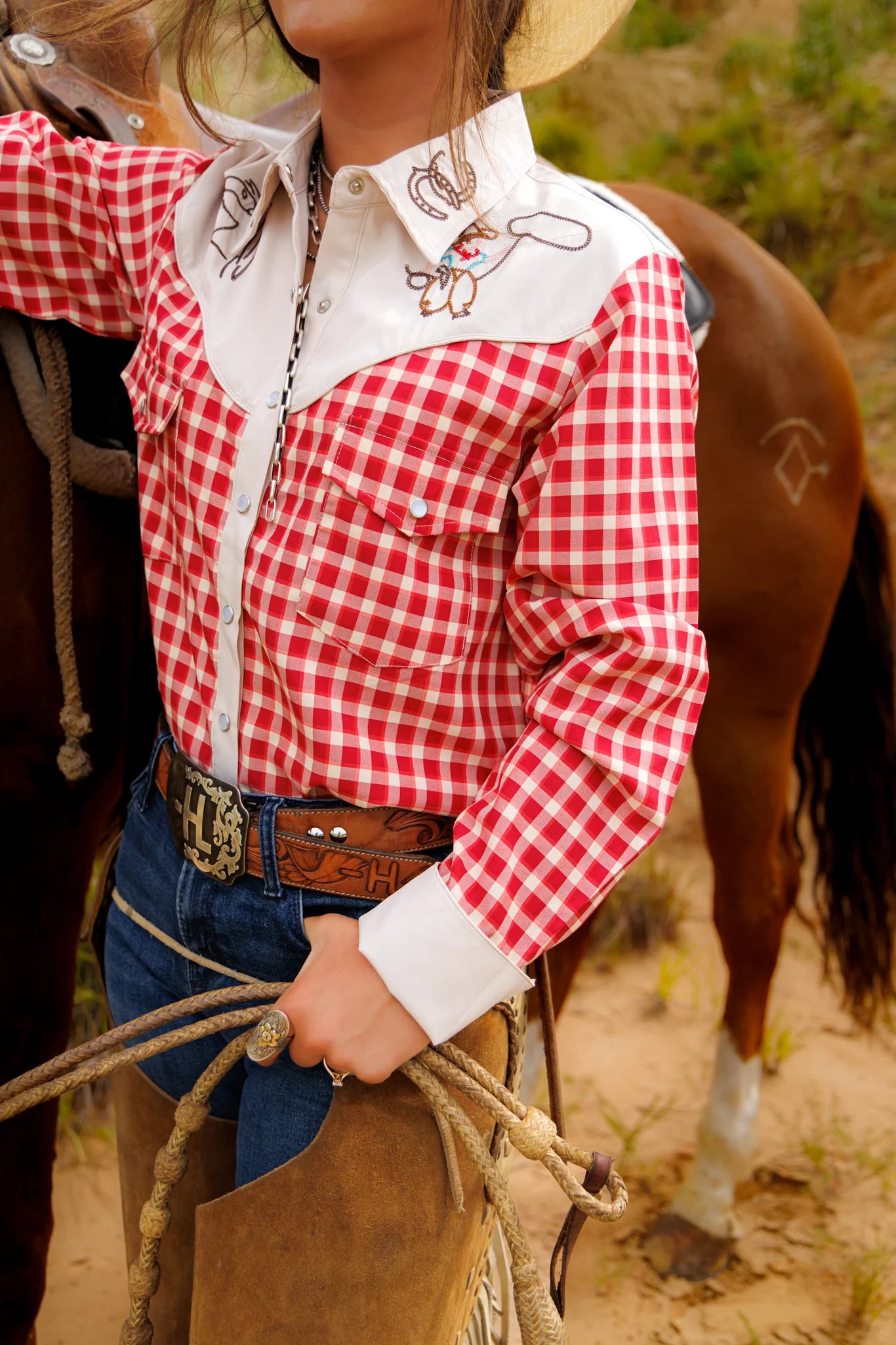 - Long sleeve red gingham pearl snap with cowboy embroidery