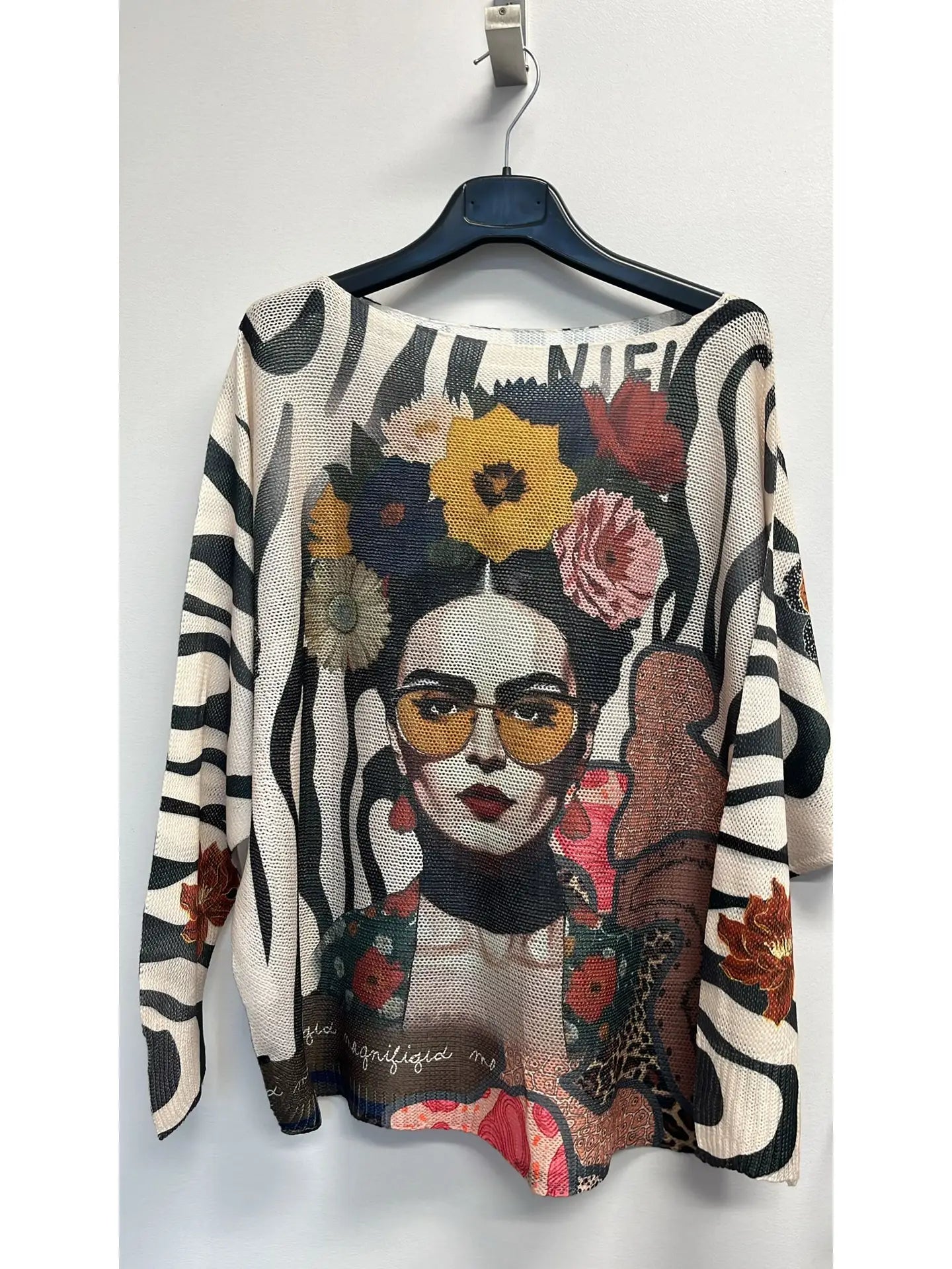 - "Frida" Glasses Round Knit Printed Sweater LOOWIE One Size Made in Italy 62% Polyester 33% Viscose 5% Elastane