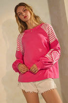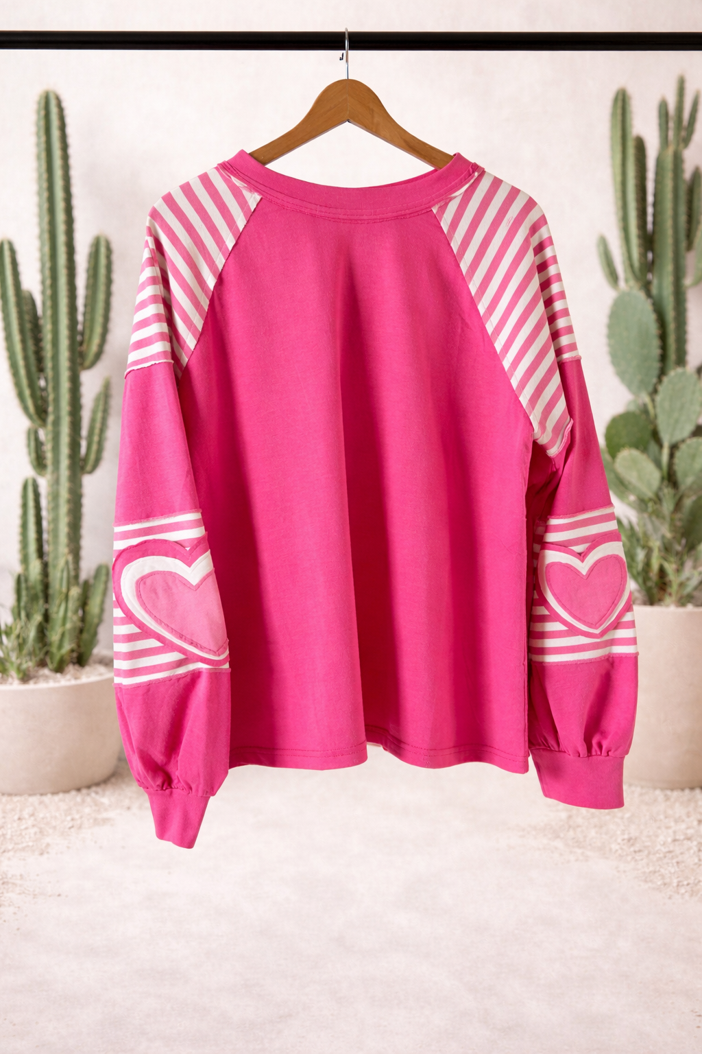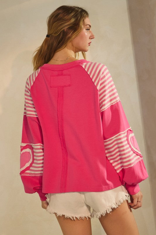 French terry sweatshirt with striped raglan sleeves and heart elbow patches.