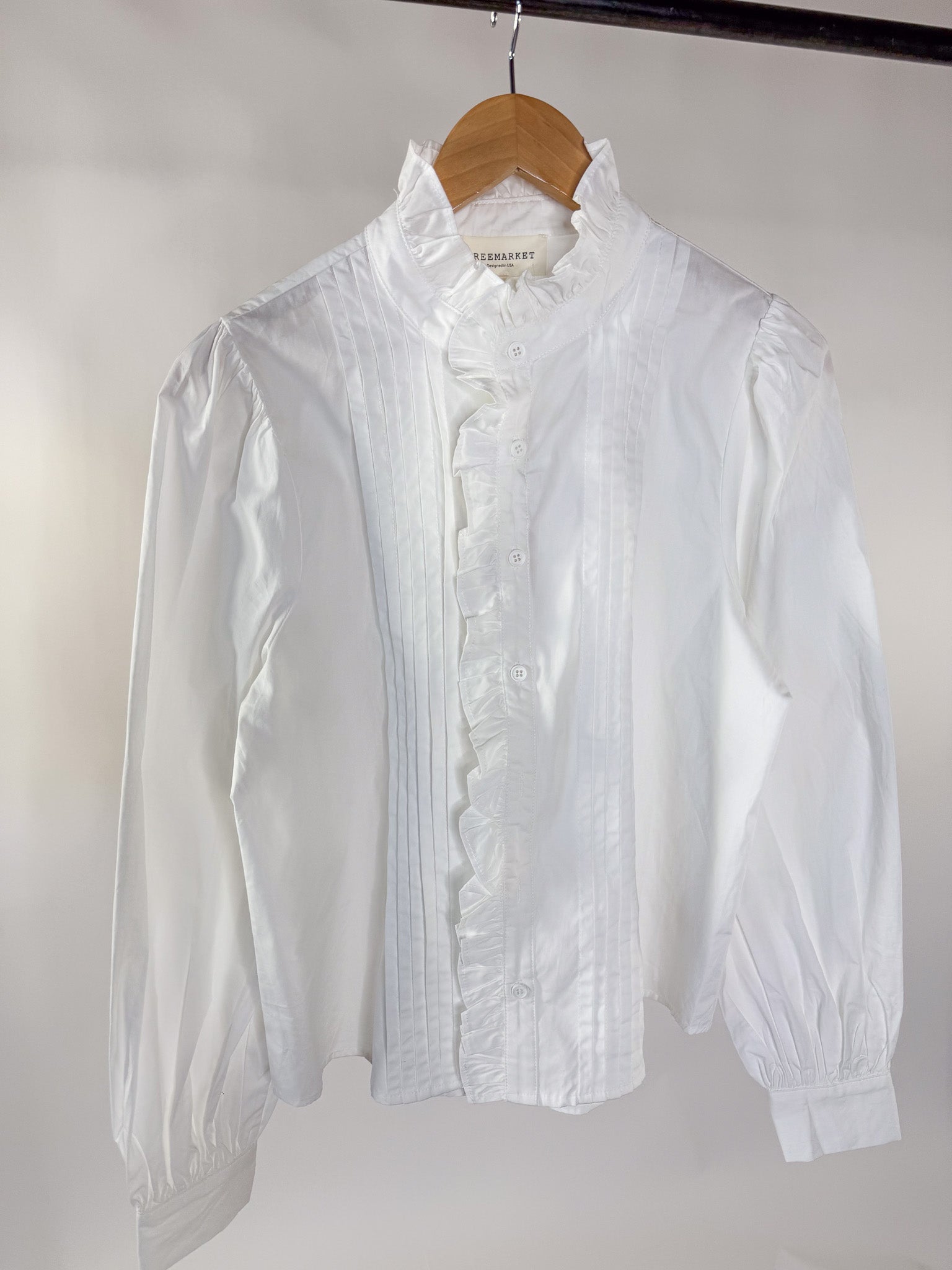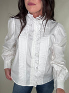 - White ruffle button down top